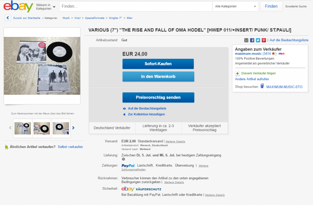 Now, this is funny. I did this record in 1986 and it is a real & rough document of some of the bands i did hang around with in the early 80s. And it sold for 6 DM (about 3€ nowadays) … and someone wants to score 24€ today. Wow!