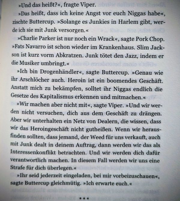 Boah, was ein cooles Buch. Irgendwie als ob Chester Himes die Bill Moody Reihe (bei Unionsverlag) neu geschrieben hat. Echte Jazzer, echte Referenzen. Aber black hard boiled!